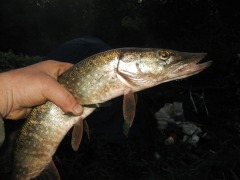 Итак, снасти насторожены. Леска на них закреплена в расщепе ивового прута, а сигнализатором поклёвки служит фидерный бубенчик. Судя по пустым забросам спиннингом, на клёв надеяться нет особого смысла. Но что это? Вот забренчал бубенчик, задёргалась вершинка прута. Есть! На леске рывками ходит щука, ну, щучка с кило весом. Но и этого мы уже не ждали. Значит, есть ещё рыба в нашей речке! Пяток щук поймали мы в это утро. Отвели душу.