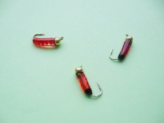 Автор тоже надеется «разловить» мормышку в это перволедье. Обычно приманки «Мотыль светящийся» идут в наборе из 5 штук, с разными цветами. Я получил посылку с 3 мормышками почти одного вида и цвета. Рыбак, автор фото с рыбой, хвалил именно такие алые мормышки с золотистой бусиной. Кстати, названия в описании не обнаружил. Назвал сам по тому, как представлен цвет приманки в характеристиках – мотыль светящийся.